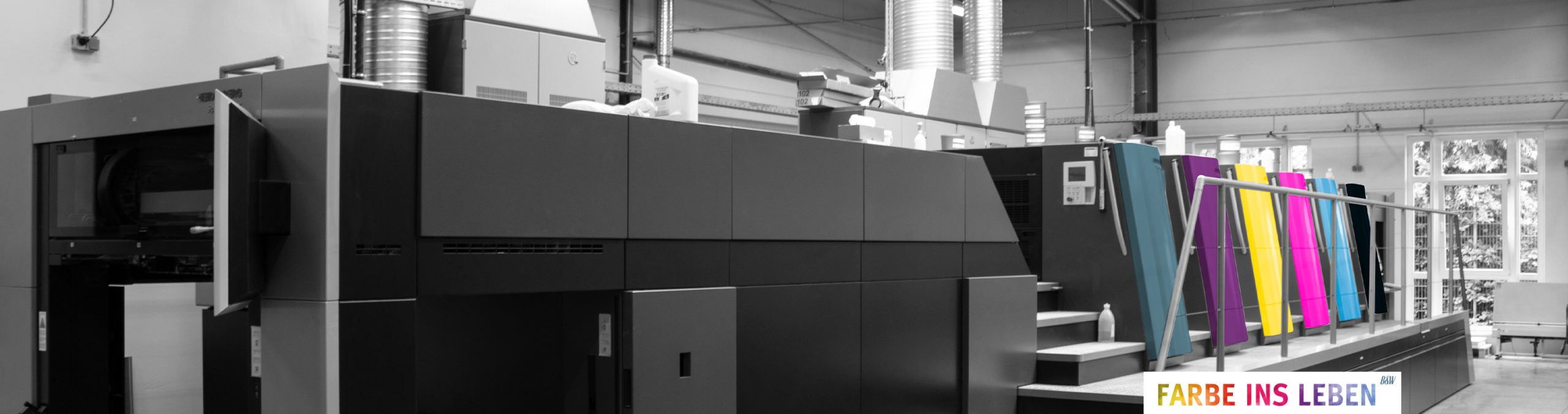 Aktuell drucken wir auf 3 Offset-Maschinen im 3b-Format (Heidelberg XL 106 5 Farben plus Lack, Komori Lithrone 6 Farben plus Lack und Heidelberg Speedmaster 102 4 Farben mit Wendung), einer Speedmaster SM 52 5 Farben sowie 2 Digitaldruckmaschinen (HP Indigo und Konica-Minolta) Wir verarbeiten auf 4 Schnellschneidern, 5 Falzautomaten, einer Sanwa Stanzpresse, Heidelberg Tiegeln und Zylindern sowie auf 4 Hochleistungs-Sammelheftern.